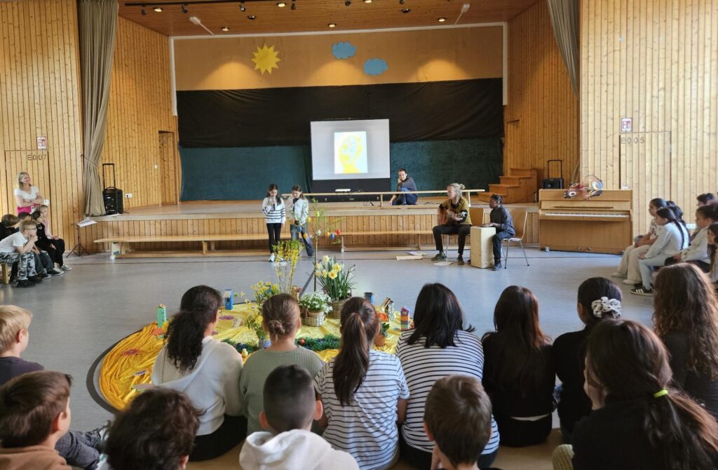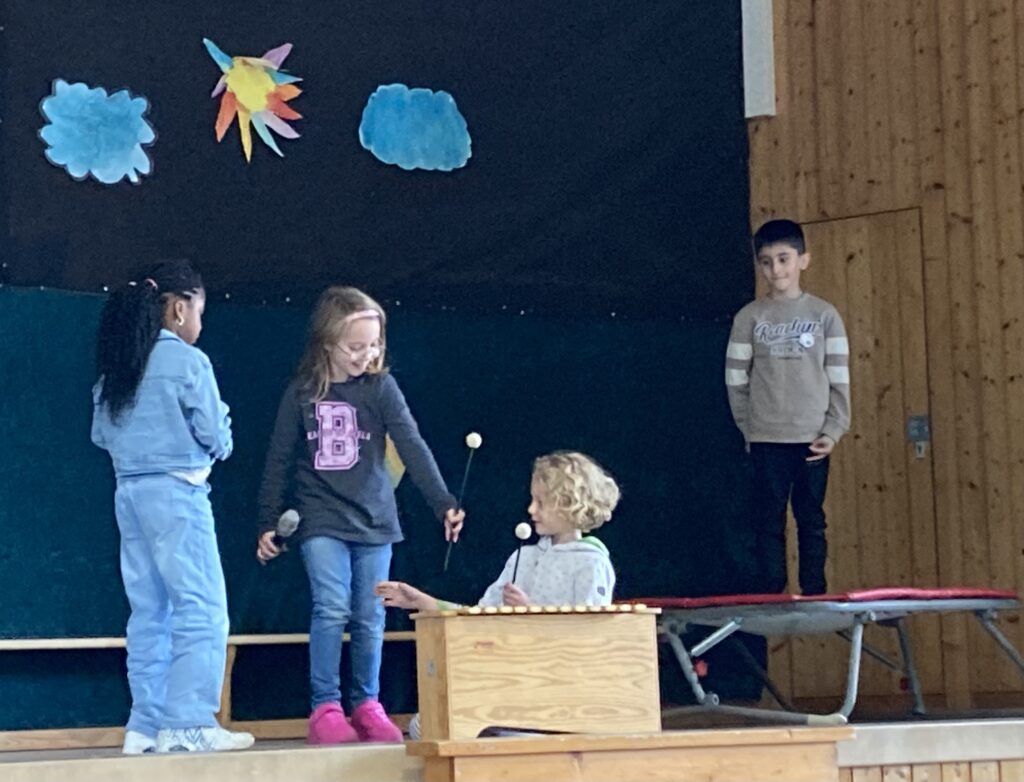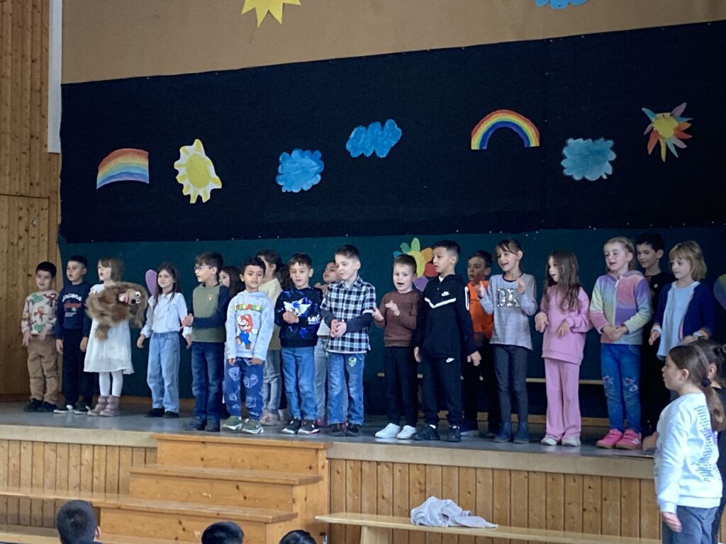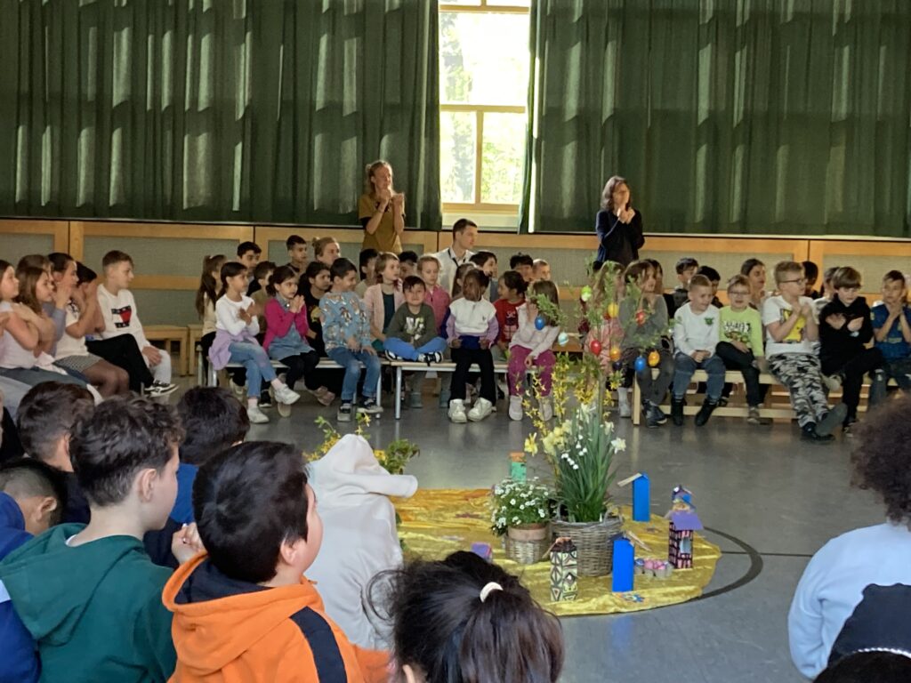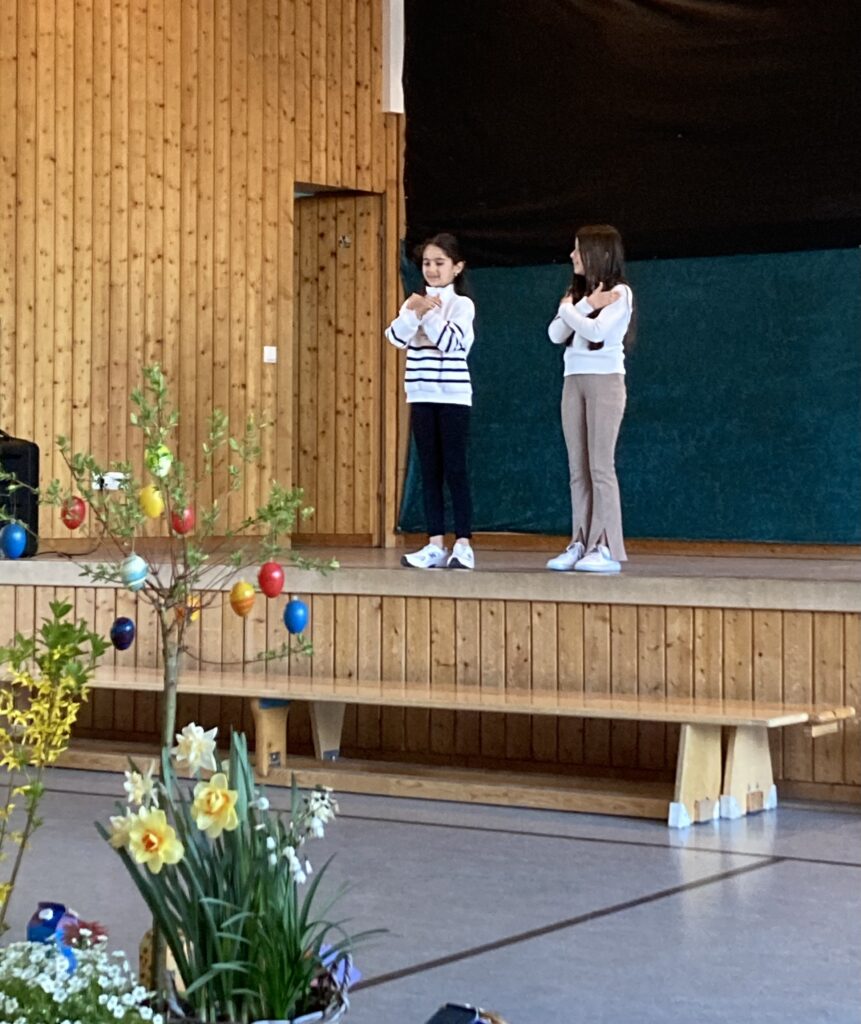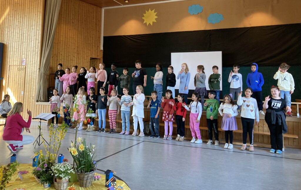 Mit fröhlichen Frühlingsliedern feierten die Kinder vor den Osterferien eine schöne Monatsfeier. Der Chor stimmte die Klassen mit einem motivierenden Rhythmical zum Frühling und dem lustigen Lied „Stups, der kleine Osterhase“ ein und es folgten viele abwechslungsreiche Beiträge aus den Klassen und Arbeitsgemeinschaften.