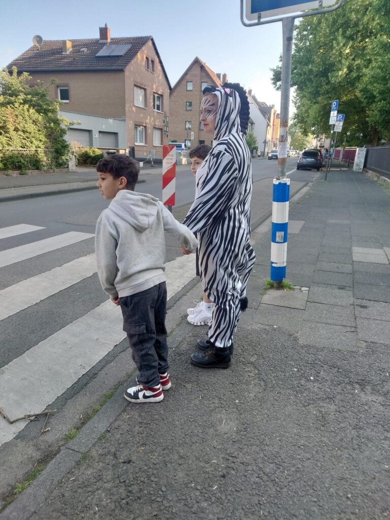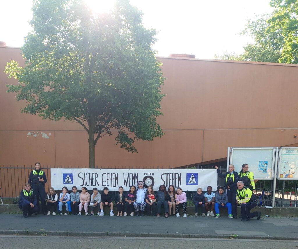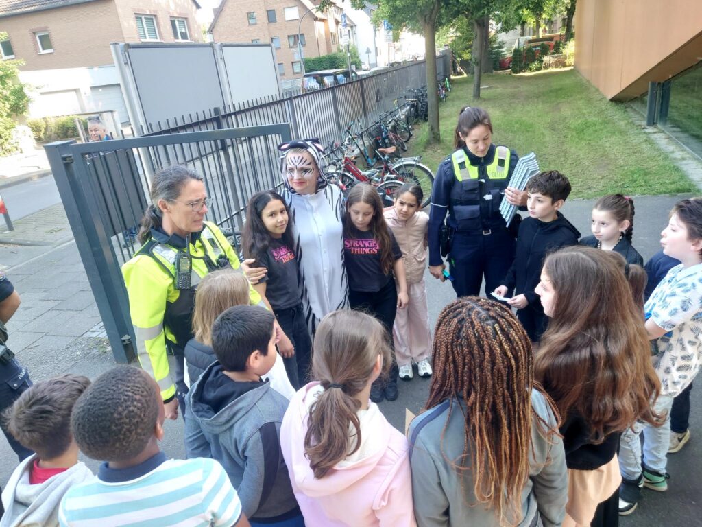 Heute fand an unserer Berthold-Otto-Schule eine besondere Aktion in Zusammenarbeit mit der Polizei statt, die die Bedeutung unseres Zebrastreifens in den Mittelpunkt stellte. Unter dem Motto „Sicher gehen wenn Reifen stehen“ haben die Kinder gemeinsam mit einem verkleideten Zebra die richtige Überquerung des Zebrastreifens geübt. Dabei wurde deutlich, wie wichtig es ist, beim Überqueren aufmerksam zu sein und auf die Fahrzeuge zu achten.